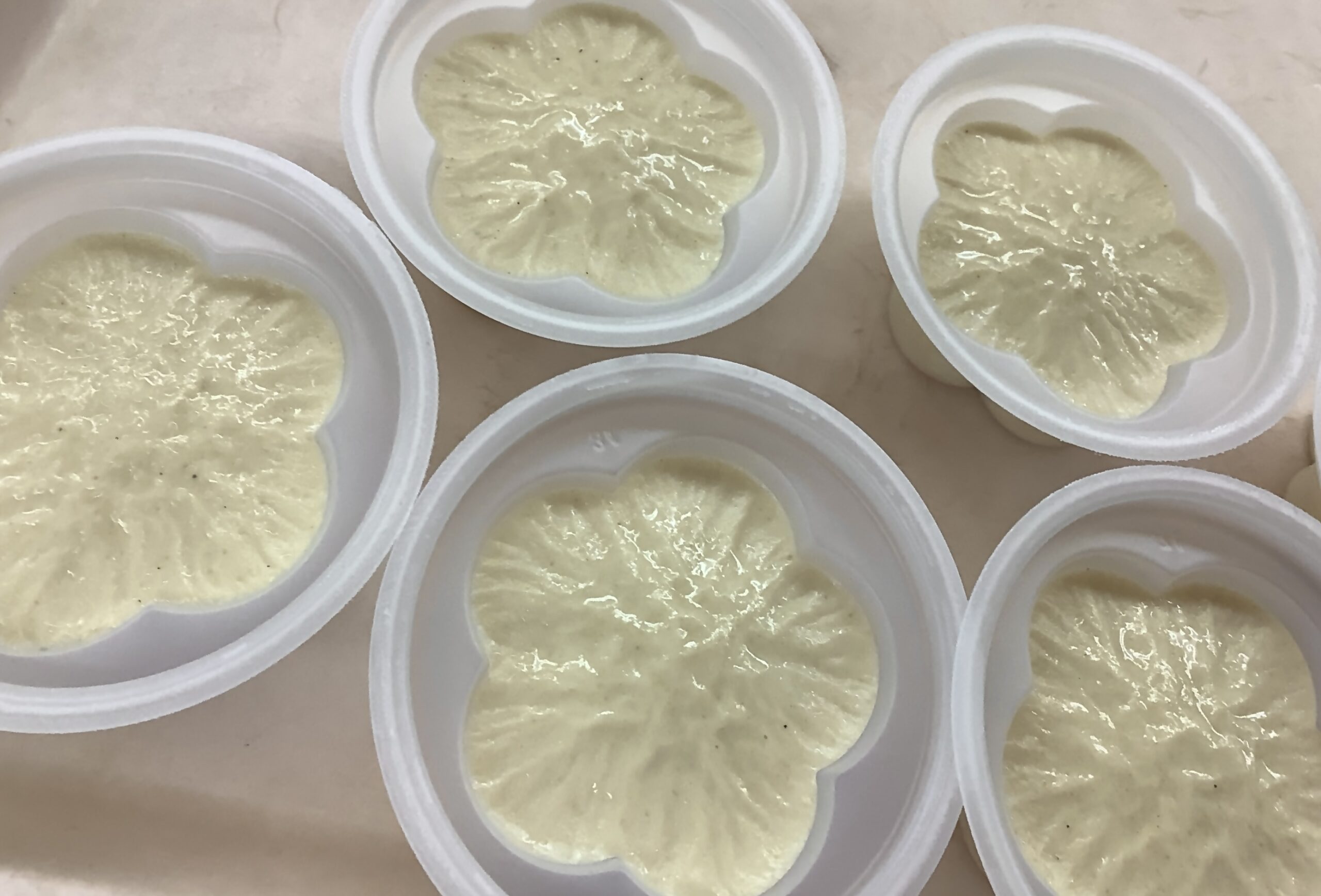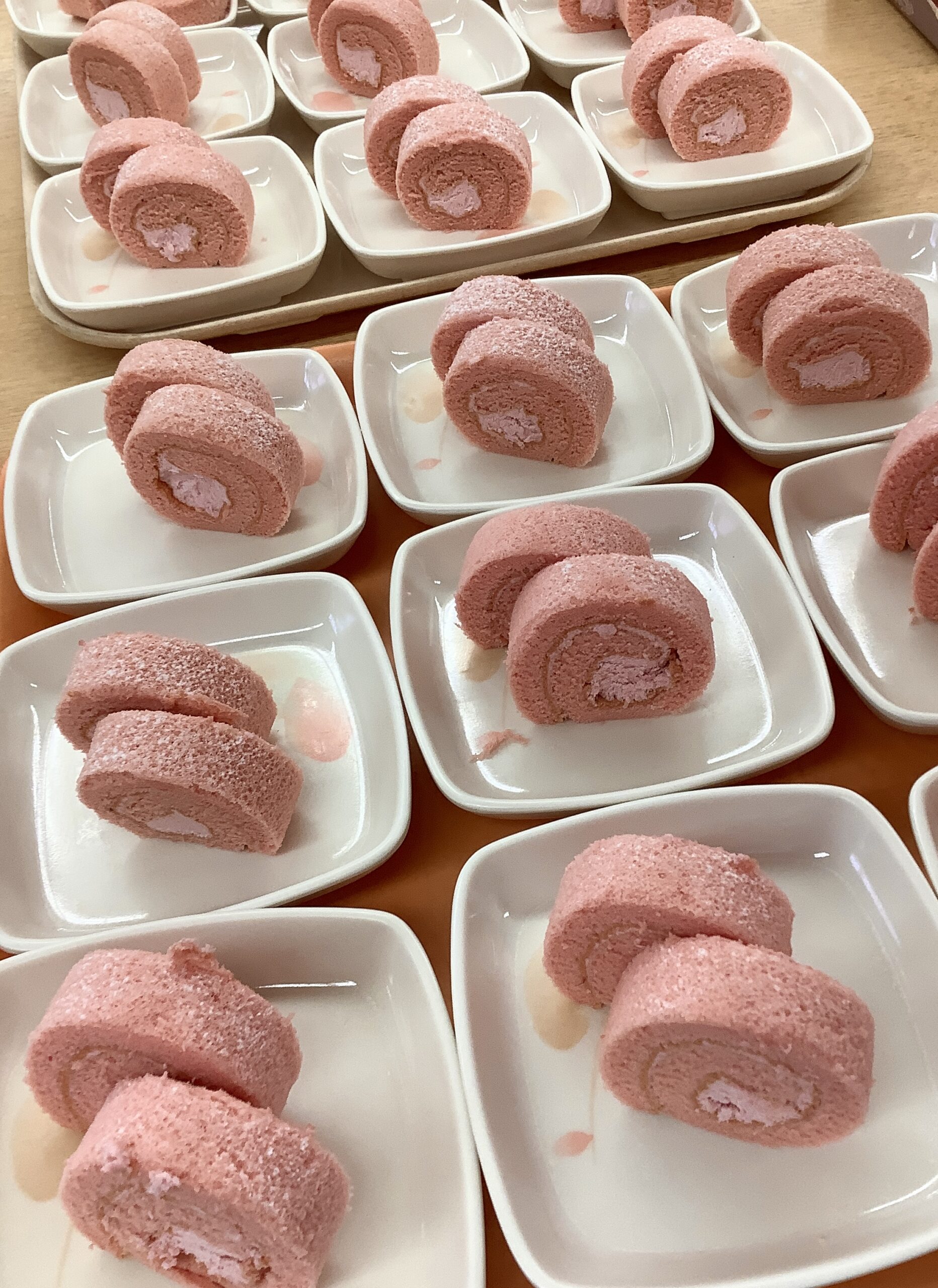 おやつは春らしい、いちごのロールケーキ、嚥下機能が低下している方には白ごまプリンを提供しました。